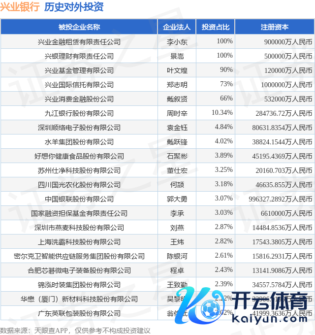 本站音问,把柄天眼查APP败露,兴业银行(601166.SH)新增整个对外投资事件,被投资公司为上海洗霸科技股份有限公司,法定代表东谈主王炜,投资占比为2.82%。该公司从事生态保护和环境惩处业九游体育app娱乐,注册成本为17543.3805万东谈主民币。现在,兴业银行共存在对外投资223项,投资占比前20的神色见下表: