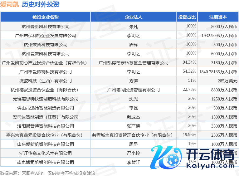 本站音讯,笔据天眼查APP袒露,爱司凯(300521.SZ)新增一说念对外投资事件,被投资公司为山东爱新凯智能科技有限公司,法定代表东说念主周显,投资占比为19%。该公司从事贪图机、通讯和其他电子设立制造业,注册成本为1000万东说念主民币。当今,爱司凯共存在对外投资16项,详见下表: