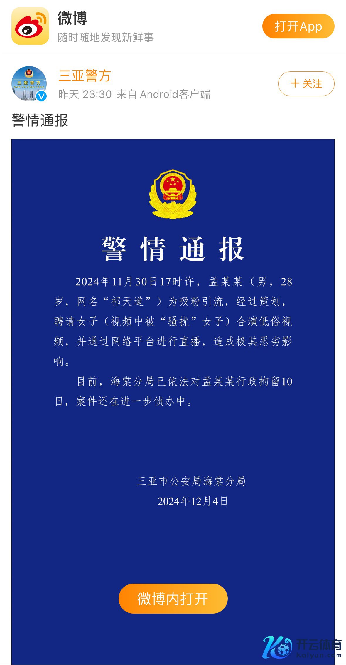 2024年11月30日17时许,孟某某(男,28岁,网名“祁天谈”)为吸粉引流,经过接头,聘任女子(视频中被“错杂”女子)合演低俗视频,并通过辘集平台进行直播,酿成极其恶劣影响。